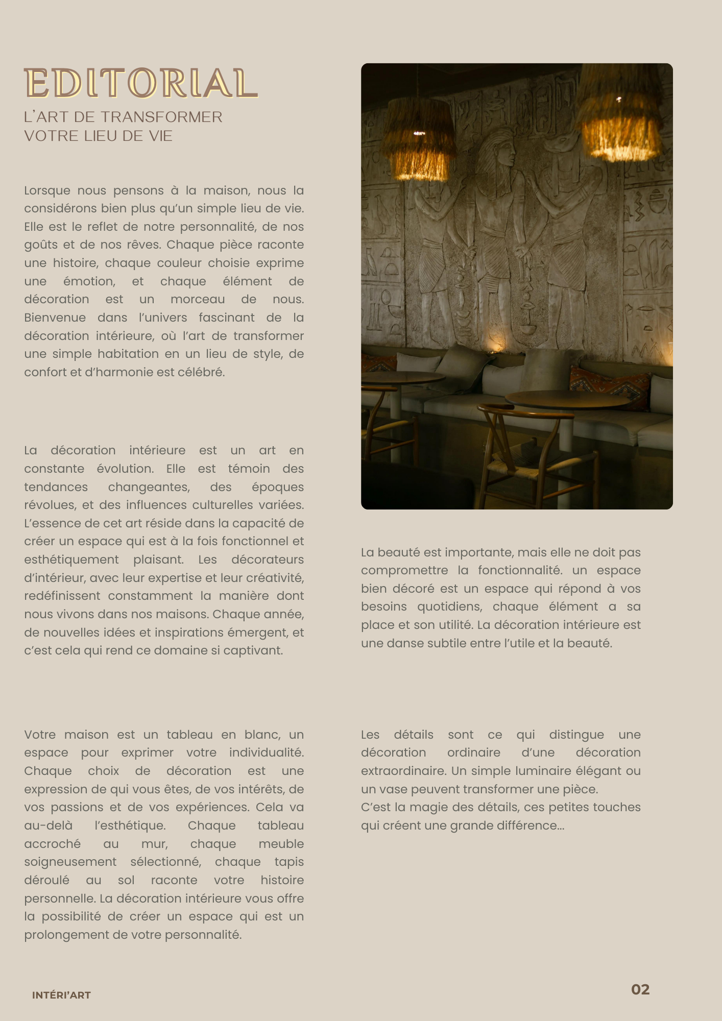 Interi’Art est un magazine indépendant imaginé pour mettre en lumière les univers de la décoration intérieure, du design et de l’art de vivre. Pensé comme un objet élégant et inspirant, ce projet donne vie à un contenu éditorial riche, visuellement soigné, entièrement tourné vers les esthétiques modernes et les ambiances qui racontent une histoire.